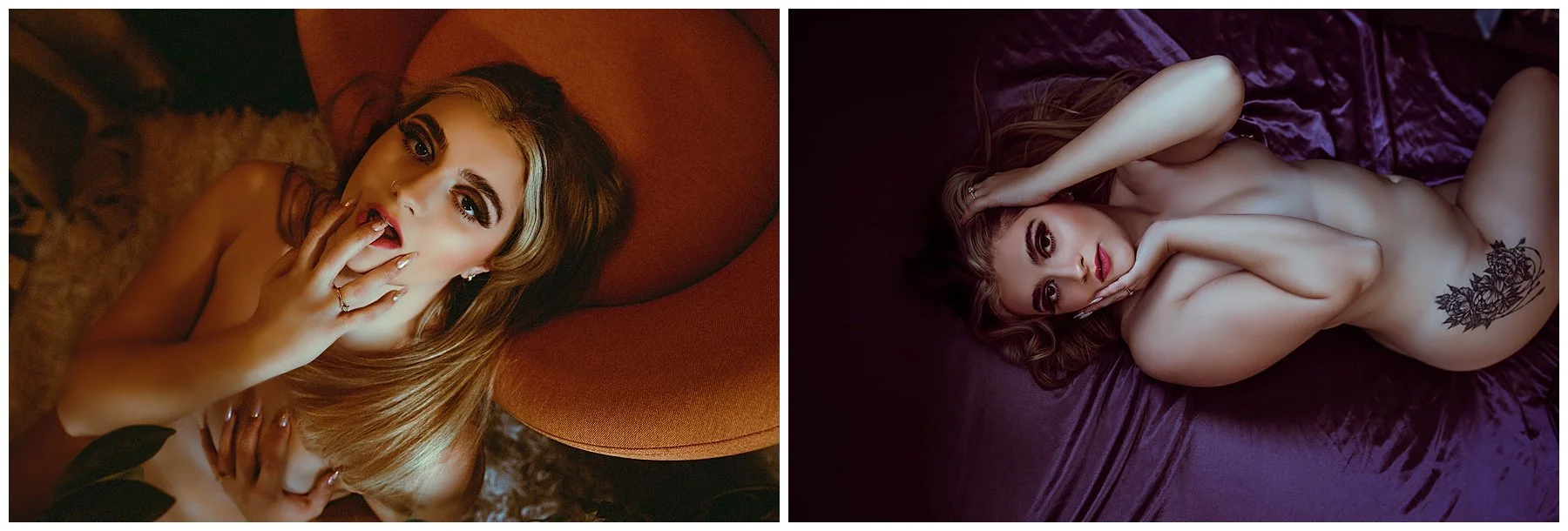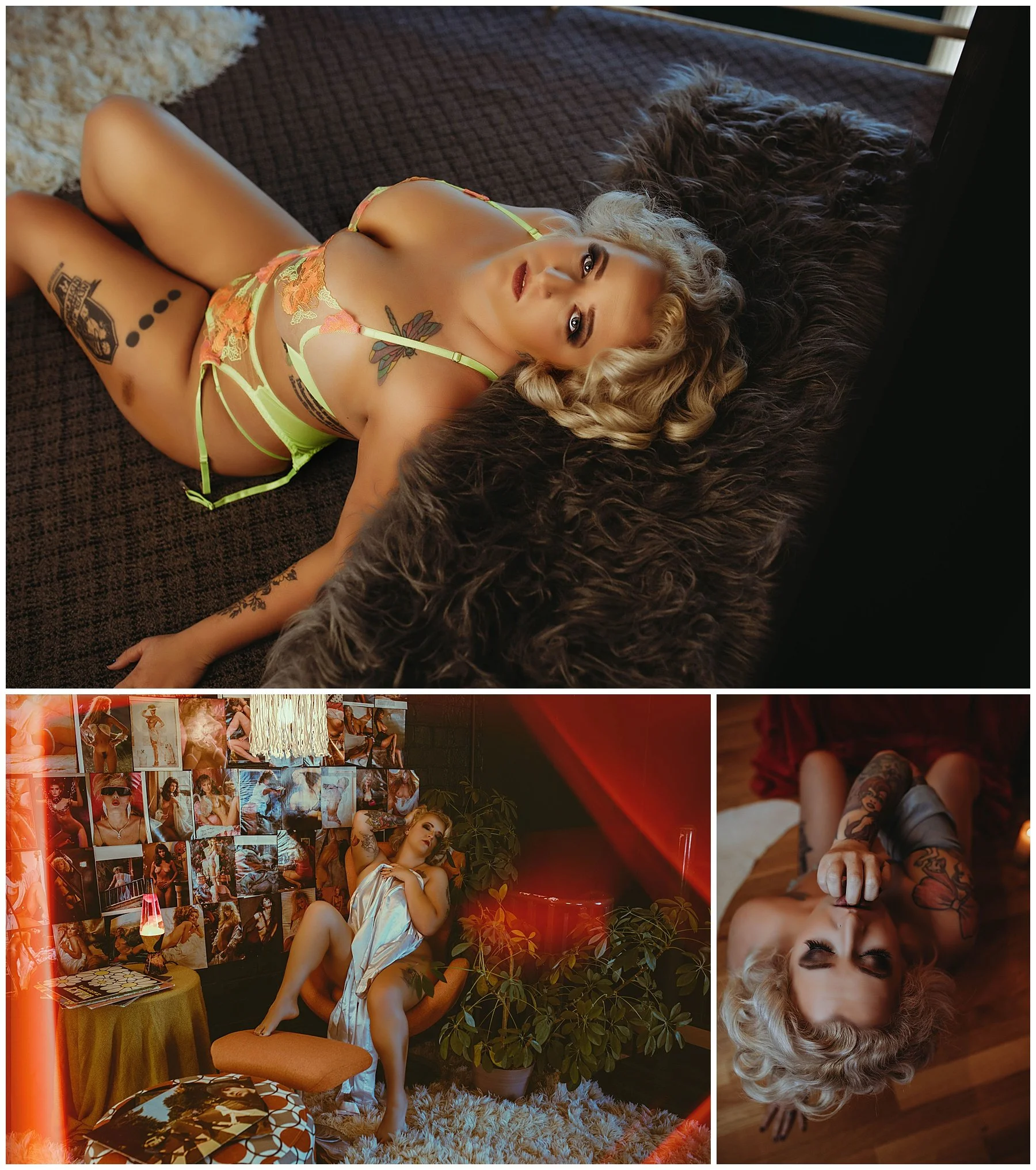 Collage of three boudoir photos featuring a person with blonde hair and tattoos in various poses, wearing lingerie and a robe in a styled room with retro decor and soft lighting.